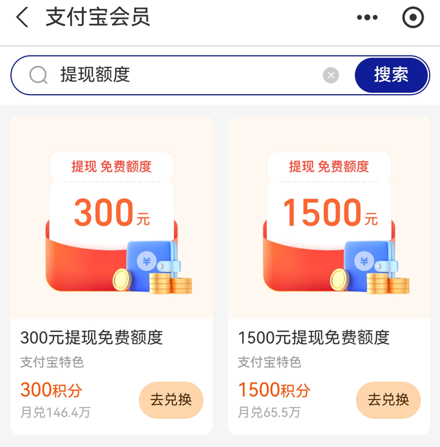 虽然不同级别的支付宝会员,兑换同一免费额度所需的积分不同,但是同一用户每天可以兑换10次,10次1500元的提现免费额度就是15000元了。这种方法,更适合支付宝积分充足的用户。
